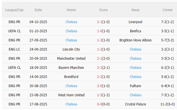 Thống kê 5 trận gần nhất của Chelsea (mọi đấu trường, bao gồm Premier League và các cúp quốc nội):